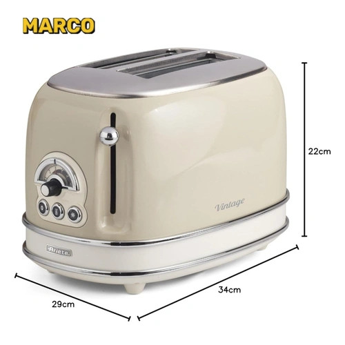 برند آریته زیر گروه شرکت دلونگی ایتالیا است و از این رو محصولات این برند از کیفیت بسیار بالایی برخوردار می باشند. توستر آریته مدل Vintage 155 از سری Vintage شرکت آریته می باشد. سری Vintageشرکت آریته را می توان یکی از شاهکارهای طراحی صنعتی در حیطه لوازم خانگی دانست. این مجموعه دارای طراحی کلاسیک بوده و در کنار ظاهر بسیار زیبا، از لحاظ فنی بسیار پرقدرت و با کیفیت می باشد. سری Vintage شامل:کتری برقی،دستگاه اسپرسو، قهوه ساز، ،آون توستر،آب مرکبات گیری، همزن و فوم میکر می باشد. توستر آریته مدل Vintage 155 دستگاهی بسیار بادوام و زیبا می باشد. این دستگاه دارای دو درگاه قرارگیری نان دارد و قابلیت یخ زدایی و تنظیم حرارت دارد.