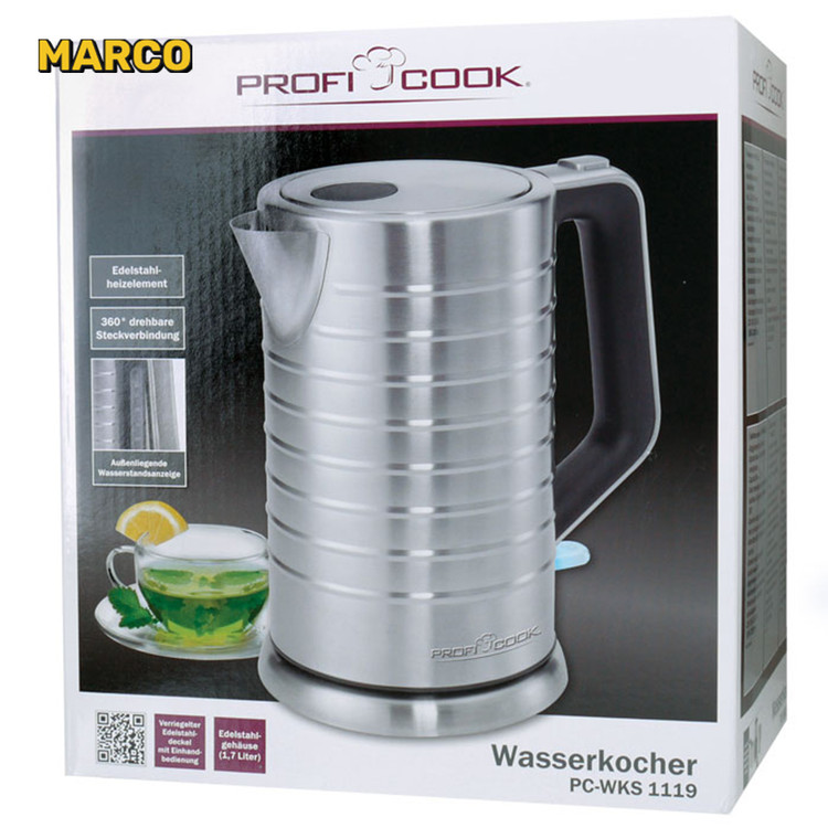 کتری برقی پروفی کوک ProfiCook PC1119 جزو زیباترین کتری برقی های بازار می باشد ،طراحی بسیار زیبا و بدنه از جنس استیل ضد زنگ میتواند انتخاب مناسبی برای شما باشد. این محصول با ظرفیت 1.7 لیتر مقدار مناسبی آبجوش با زمان کوتاه در اختیار شما بگذارد ، این وسیله در زمان مهمانی یا وقتی خانواده دور هم جمع شده بسیار کاربردی است و با خیال راحت میتوانید پذیرایی کنید.ایمنی بالا در برابر تمام شدن آب کتری در حالت روشن بودن کتری و قطع کردن اتوماتیک برق کتری آن را به یک کتری برقی حرفه ای تبدیل کرده است.