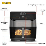 نمایشگر این دستگاه مراحل پخت را بصورت preheating, cooking, finish نشان میدهد، بعد از مرحله پیش گرمایش، روی نمایشگر مرحله add food نشان داده میشود، که در این مرحله مواد غذایی رو داخل سبد پخت قرار میدهید