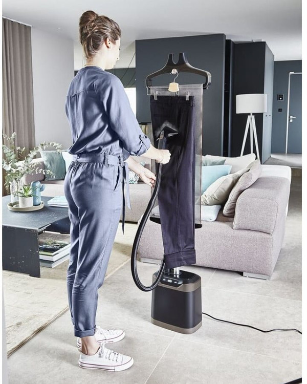 رنگ بدنه ی این اتو بخار ایستاده مشکی است. که رنگی بسیار زیبا و شیک و جذاب است و به آسانی با هر دکوراسیونی هم خوانی پیدا می کند. این محصول دارای یک عدد آویز می باشد که می توانید لباس را روی آن آویز آویزان کنید و به اتو کردن به صورت عمودی بپردازید که هم بسیار آسان است و هم سرعت اتو را تا حد بسیار زیادی بالا می برد. در کفه ی این اتو فلز چدن وجود دارد که موجب بالاتر رفتن کیفیت اتو می شود.