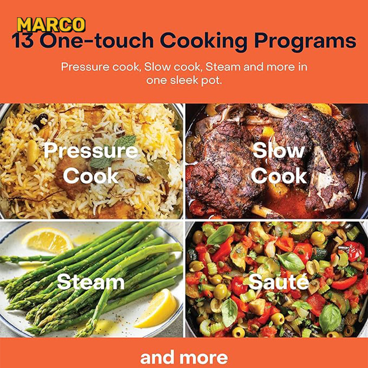 وجود سیستمهای ایمنی پیشرفته در قسمت درب و قفل ایمنی چندگانه، خیال شمارا از بابت هرگونه مشکل و اتفاقی درحین پخت آسوده خواهد کرد. بدنه مقاوم و طراحی شده از استیل ضد زنگ به رنگ دودی و بخشهای پلاستیک فشرده (قسمت درب و زیر دستگاه) استحکام و ماندگاری مولتی کوکر نوتریکوک 210 را ضمانت میکند. وجود 14 عملکرد کاربردی پخت تخصصی، از جمله حالتهای تنظیم فشار و پخت های تاخیری زماندار،وجود این دستگاه چند منظوره را برای تمامی خانوارها ضروری میکند. همچنین یک برنامه جذاب برای گرم کردن و بازگرداندن بافت غذای سرد شده و مانده وجود دارد که در ادامه مفصل در رابطه با آن توضیح داده ایم.