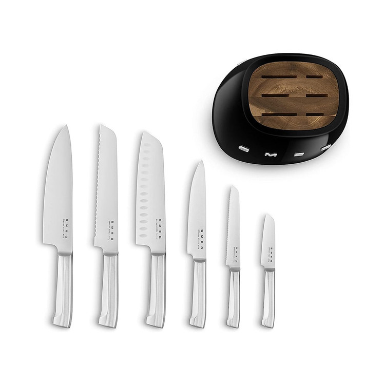 ست چاقوی استیل ضد زنگ Smeg با طراحی شیک و مدرن، انتخابی ایدهآل برای هر آشپزخانهای است. این مجموعه شامل چاقوهایی با کیفیت بالا و پایه بلوکی زیبا است که به راحتی دسترسی به چاقوها را فراهم میکند و همزمان ظاهری جذاب به آشپزخانه شما میبخشد.