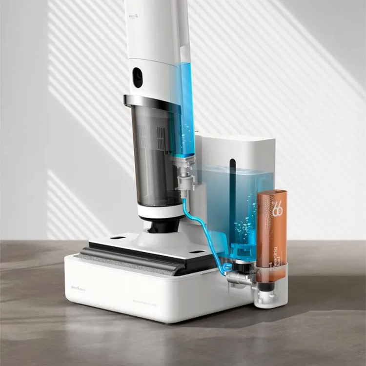 مخزن اتوماتیک آب تمیز برای پایه هوشمند نصب شده که بهطور خودکار افزودن آب را کنترل میکند. میتوانید جارو را در نیمه راه به پایه بازگردانید و مخزن آب تمیز بهطور خودکار به واحد اصلی آب اضافه میکند. بنابراین نیاز نیست تا بهصورت دستی مخزن داخلی آب جارو را پرکنید. تانکر آب تمیز شامل مواد آنتی باکتریال سیلور یون 99.9 % میشود. با آب الکترولیتی، بهطور اتوماتیک در حین کار، کف و برسهای غلتکی برای حفظ بهداشت بیشتر بهدقت تمیز میشوند.