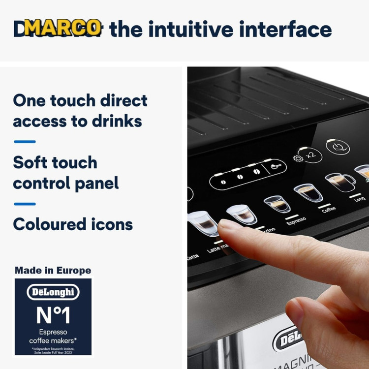 از طریق پنل لمسی با آیکونهای رنگی، میتوانید از ۷ دستور آماده مثل اسپرسو، قهوه دراز، کافه لاته، کاپوچینو و … تنها با فشردن یک دکمه استفاده کنید. همچنین سیستم خودکار شستوشوی شیر و قابلیت جداسازی واحد دمآوری، نظافت را آسانتر میکند.