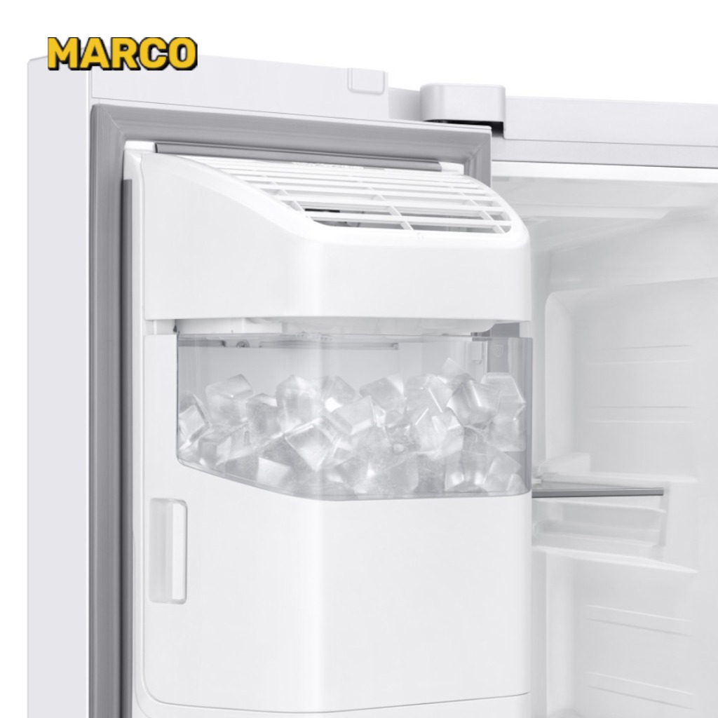 همانطور که پیش از این نیز اشاره شد یخچال فریزر مذکور دارای سیستم یخساز اتوماتیک (Auto Ice Maker) با طراحی نسبتا باریک میباشد. این یخساز پشت درب قسمت فریزر قرار گرفته و کمی از فضای داخل فریزر را اشغال میکند. این سیستم یخساز، یخ را به شکل مکعبی و خرد تولید میکند و شما میتوانید از طریق یخریز روی درب فریزر، یخ مکعبی و خرد برداشت کنید. متاسفانه این یخچال فریزر قابلیت تولید یخ کروی ندارد. روی پنل کنترلی داخل این یخچال فریزر قابلیت Ice Maker On/Off وجود دارد و شما میتوانید به کمک آن سیستم یخساز اتوماتیک را خاموش یا روشن نمایید.