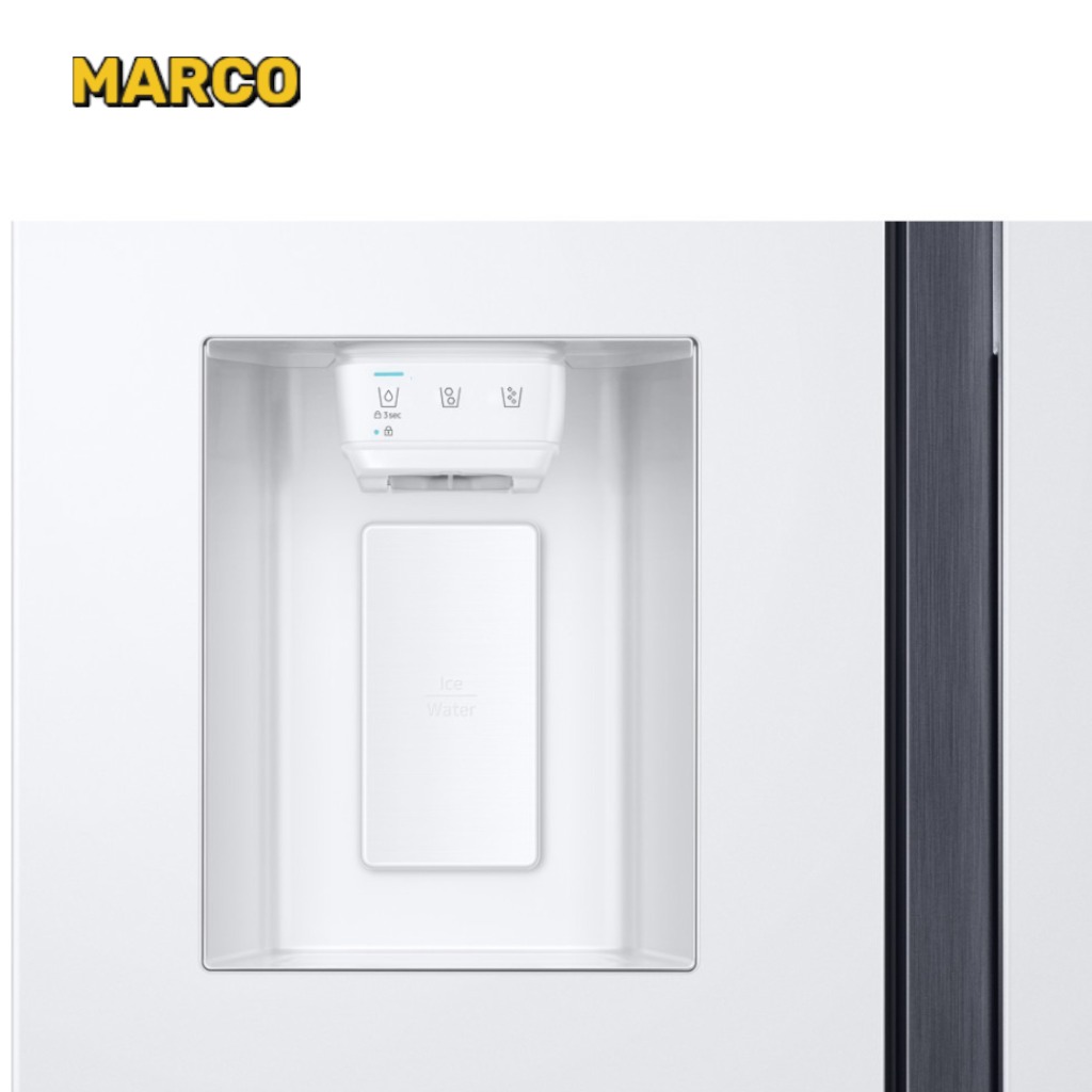 یخچال فریزر سفید سامسونگ RS80DG5402WW دارای طراحی Seamless Fit میباشد و ظاهر ساده، شیک و مینیمالی دارد که با دکوراسیون آشپزخانه شما بهراحتی هماهنگ خواهد شد. سامسونگ رنگ بدنه این یخچال فریزر را در سایت خود White اعلام نموده که در واقع همان سفید میباشد. علاوهبر آن سامسونگ جنس بدنه این یخچال فریزر را نیز EZ Clean Steel اعلام کرده که به معنای این میباشد که از جنس فولاد بوده و تمیز کردن آن به آسانی انجام خواهد شد. دستگیرههای این یخچال فریزر بهصورت مخفی (Recess Handle) ساخته شدهاند که علاوهبر راحتی در استفاده، باعث زیباتر شدن ظاهر این یخچال فریزر شدهاند.