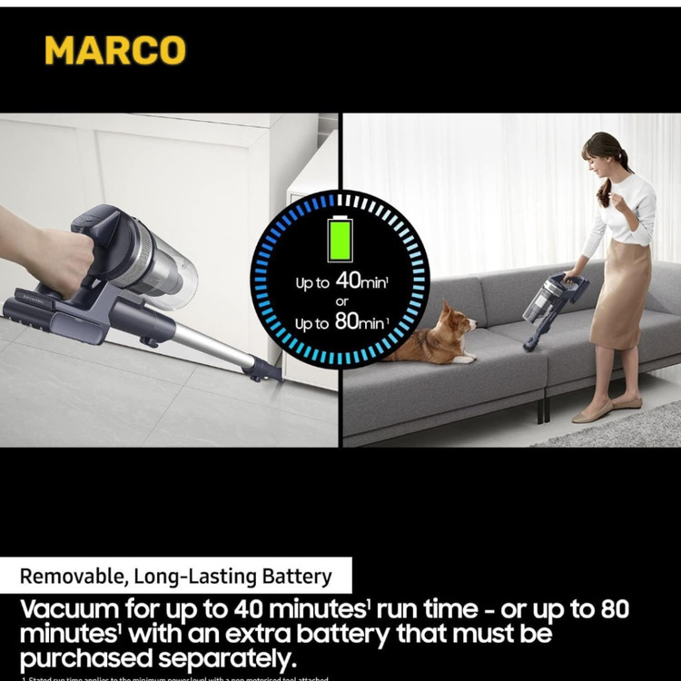 این جارو شارژی2.3 کیلوگرم وزن دارد و 250 در 203 در 120 میلی متر ابعاد آن را تشکیل میدهند. این جاروی شارژی، توان مکش 150 وات دارد و یک مخزن 0.8 لیتری دارد که میتوانید آن را بشویید. ارتفاع جارو قابل تنظیم است و همانطور که زودتر اشاره کردیم این جارو میتواند به یک جاروی دستی و کوچک تبدیل شود که توسط آن بتوانید روی مبل و بخشهایی از دیوار را تمیز کنید یا حتی آن را داخل ماشین ببرید و صندلیها و کفی ماشین را نظافت کنید. اگر هم بخواهید میتوانید جارو شارژی سامسونگ مدل JET 60-VS15A6031R4 را برای تمیز کردن زمین استفاده کنید و دسته آن را کوتاه نکنید. این محصول با یک باتری لیتیوم یونی کار میکند که برای شارژ شدن، نیاز به 210 دقیقه زمان دارد. پس از آن میتوانید به مدت 40 دقیقه با جارو کار کنید. میزان تولید صدای این جارو 86 دسی بل است. به همین علت، بهتر است آن را در مواقعی که کسی مشغول استراحت نیست روشن کنید.