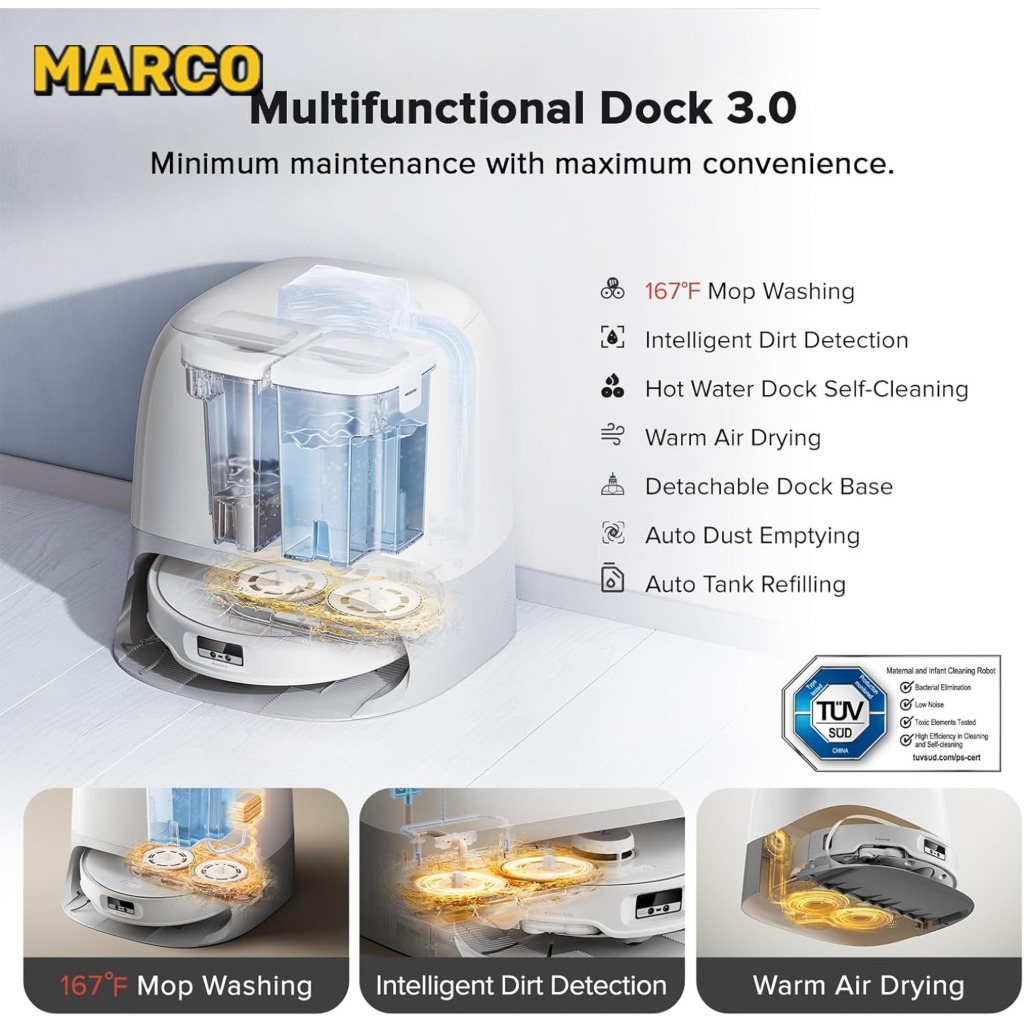 یکی از برجستهترین قابلیتهای این جارو، ایستگاه خودتمیز شونده آن است که پد تی را با آب داغ 70 درجه شستشو میدهد. این فرآیند نه تنها تمیزی بهتر را تضمین میکند، بلکه از رشد قارچها و ایجاد بوی نامطبوع جلوگیری میکند. خشککن اتوماتیک، پد را برای استفادههای بعدی آماده نگه میدارد و در درازمدت از افت کیفیت آن جلوگیری میکند.