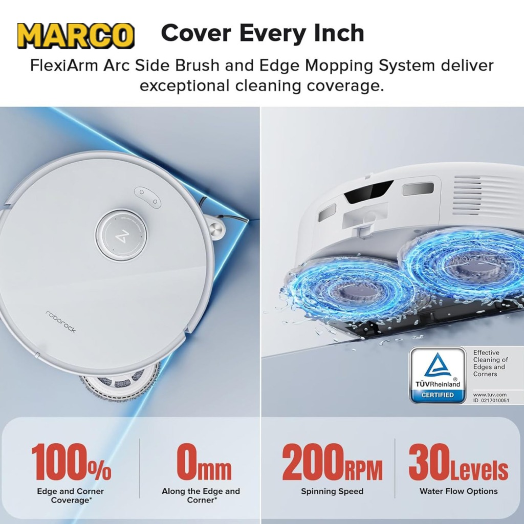 تیکشی Roborock Qrevo Curv چندین سطح را پوشش میدهد، از کفهای سخت مانند چوب و سرامیک تا فرشهای حساس. رطوبت تی بهطور هوشمند تنظیم میشود تا از آسیب به سطوح جلوگیری کند. این فناوری ناحیهای یکنواخت و بدون لکه ایجاد میکند. تی با دقت بالا و بدون نیاز به دخالت مداوم کاربر، نواحی بزرگتری را پوشش میدهد.