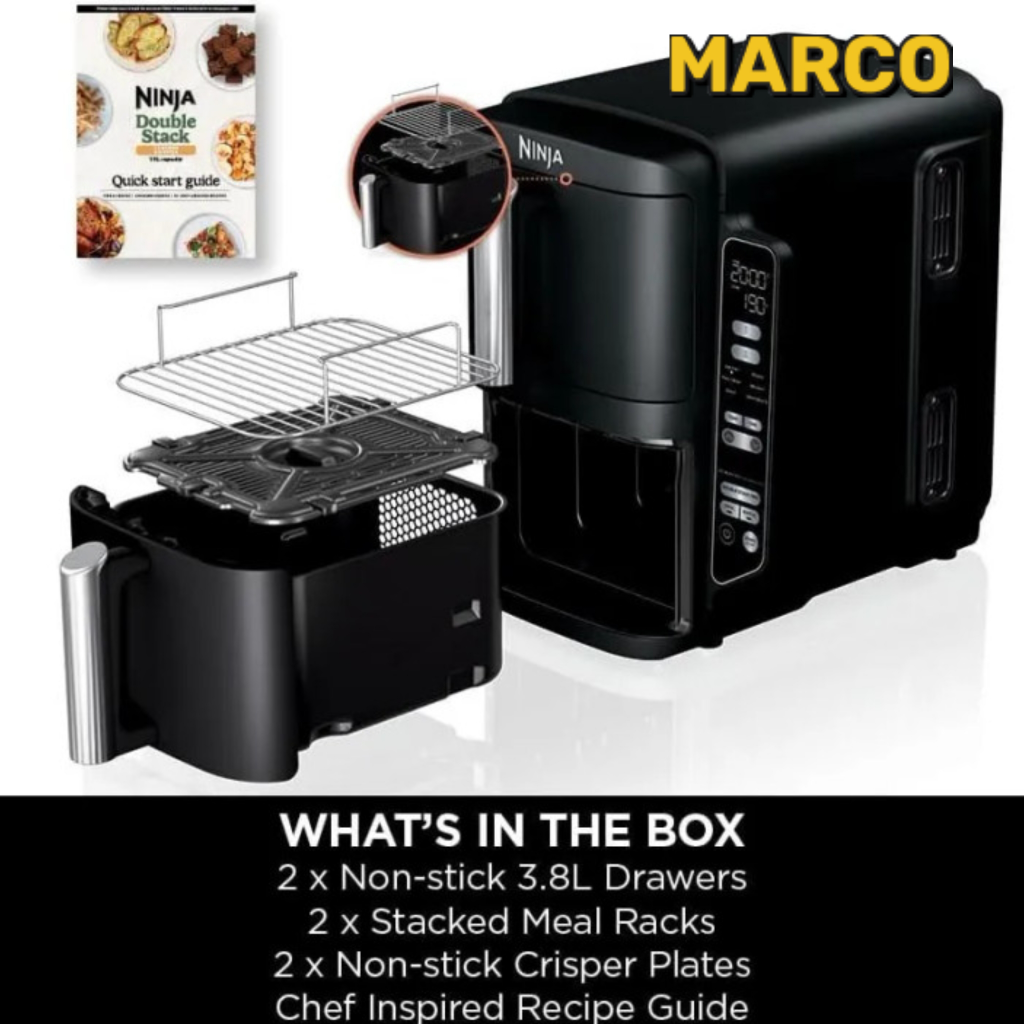 دستگاه اصلی سرخ کن 7.6 لیتری 2 محفظه یا کشوی 3.8 لیتری 2 عدد بشقاب کریسپر نچسب 2 عدد قفسه یا توری فلزی دفترچه راهنمای شروع سریع