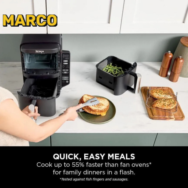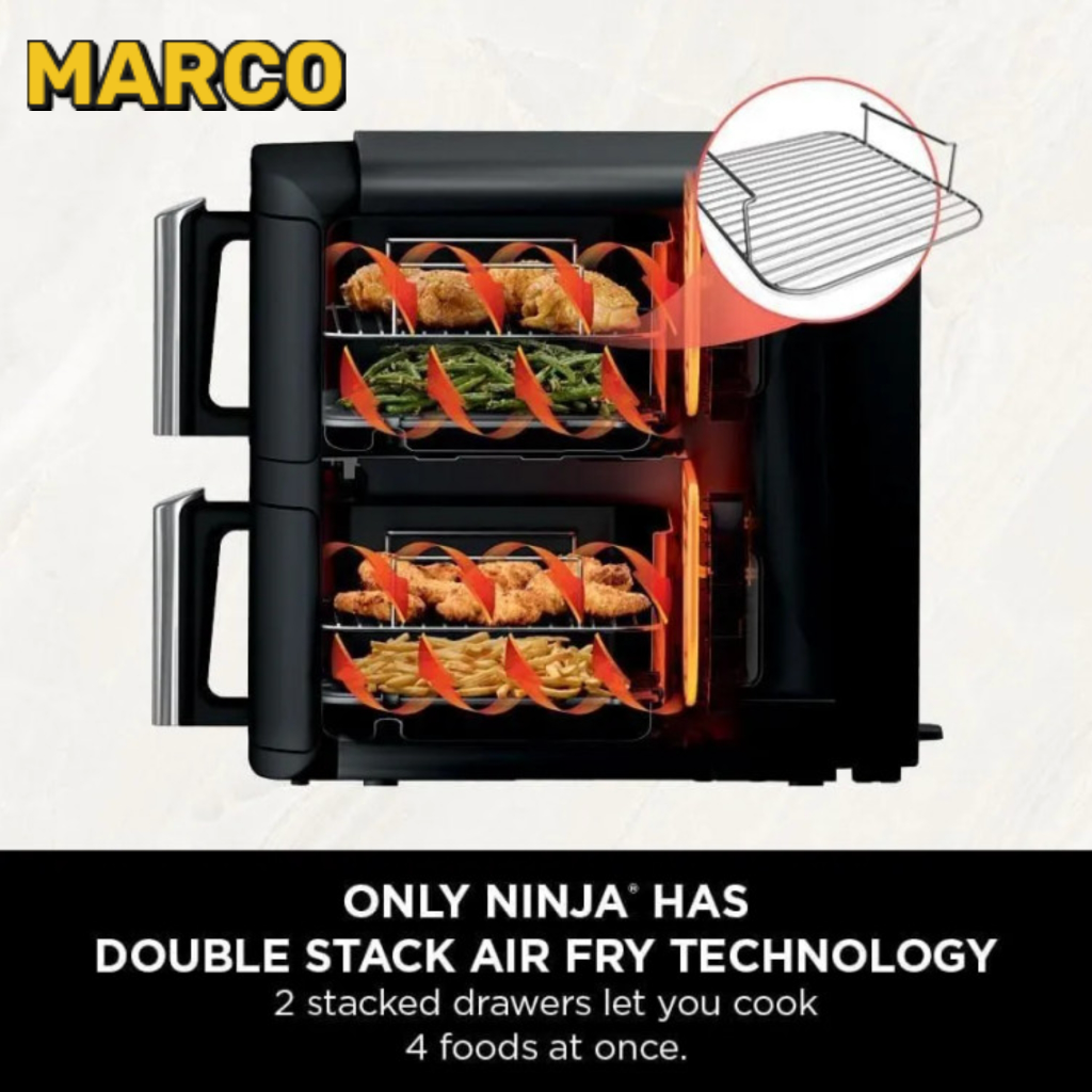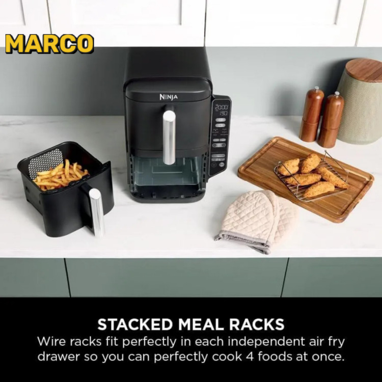 سرخ کن نینجا مدل SL300 محصولی با ظاهر خاص و جدید بوده که با طراحی دو طبقه روی هم، وجود دو کشو و هر کشو شامل دو قفسه سبب شده تا بتوانید همزمان 4 نوع غذای متفاوت را طبخ کرده و خیلی راحت 55 درصد سریع تر از فرهای فن دار غذاهای دلخواهتان را تهیه کنید و از آشپزی آسان و سریع لذت ببرید. سرخ کن ninja SL300 پیشنهادی عالی برای شماست اگر هر کدام از اعضای خانواده تان ذائقه و سلیقه مخصوص به خود را دارند و شما می توانید با توجه به علاقه هر شخص غذای دلخواه او را همزمان درست کنید و سر سفره چندین تنوع غذایی داشته باشید.