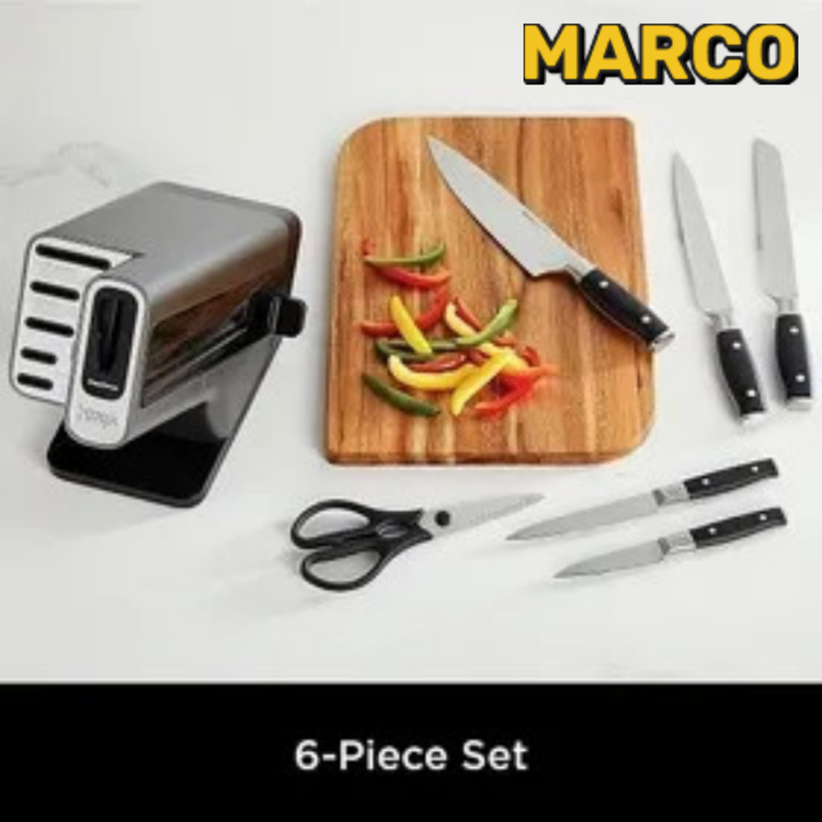 این سرویس شامل 6 چاقوی کاربردی است که هرکدام برای نوع خاصی از برش طراحی شدهاند؛ از خرد کردن سبزیجات گرفته تا قطعهکردن گوشت. دستههای ضد لغزش آن، ایمنی و راحتی در استفاده را تضمین میکنند، حتی هنگام کار طولانیمدت.